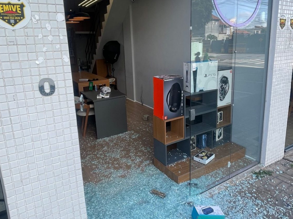 Imagens da câmera de segurança registraram o momento do assalto, dois homens chegaram ao local, quebraram o vidro da fachada e levaram diversos aparelhos celulares.